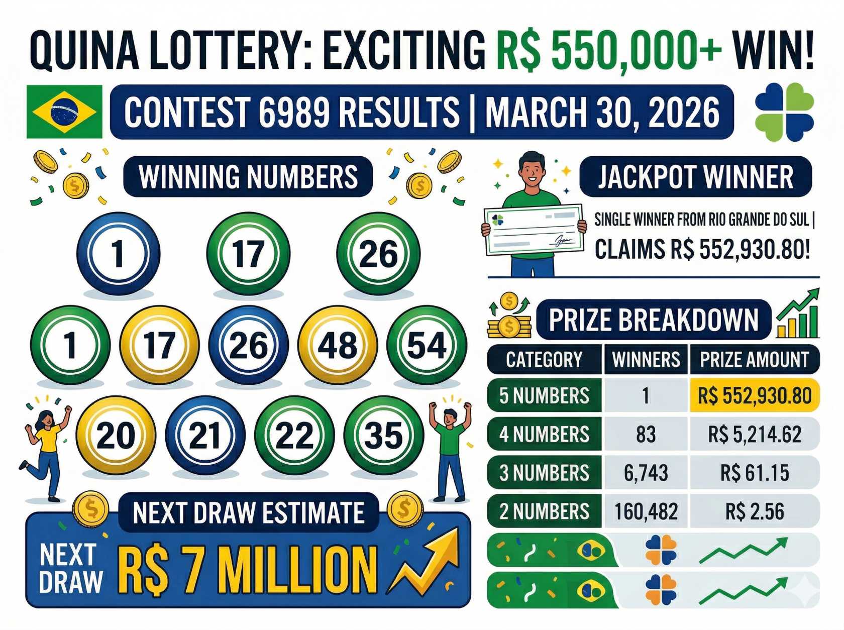 Brazil’s Quina lottery delivered an exciting result on March 30 2026 as a single lucky player from Rio Grande do Sul secured the top prize in Contest 6989. The draw created buzz among regular players, especially with a solo winner claiming more than half a million reais.