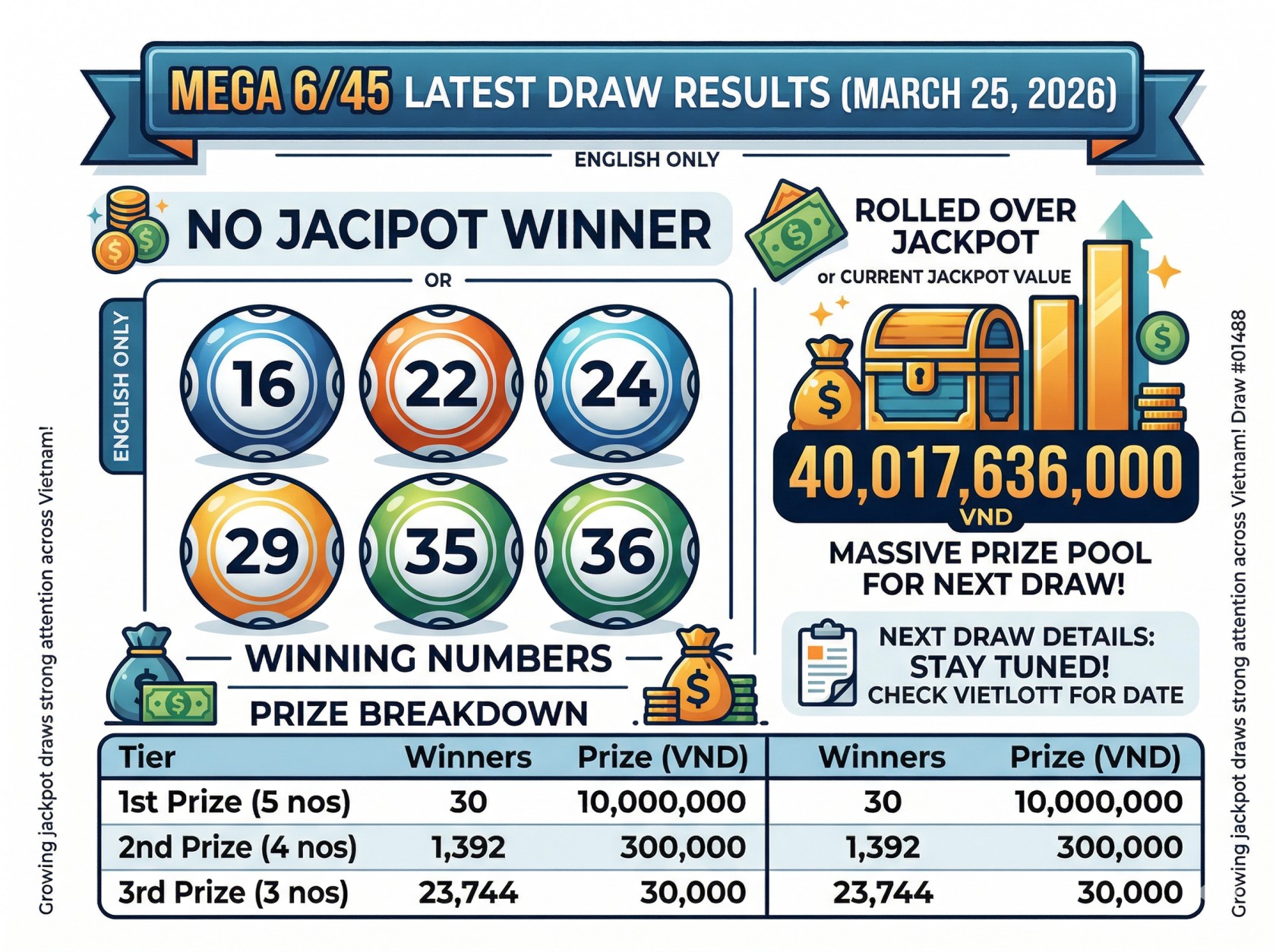 The latest draw of Mega 6/45 held on March 25, 2026 has ended without a jackpot winner, pushing the prize pool to a massive 40,017,636,000 VND. The growing jackpot is now drawing strong attention from players across Vietnam as anticipation builds for the next draw.