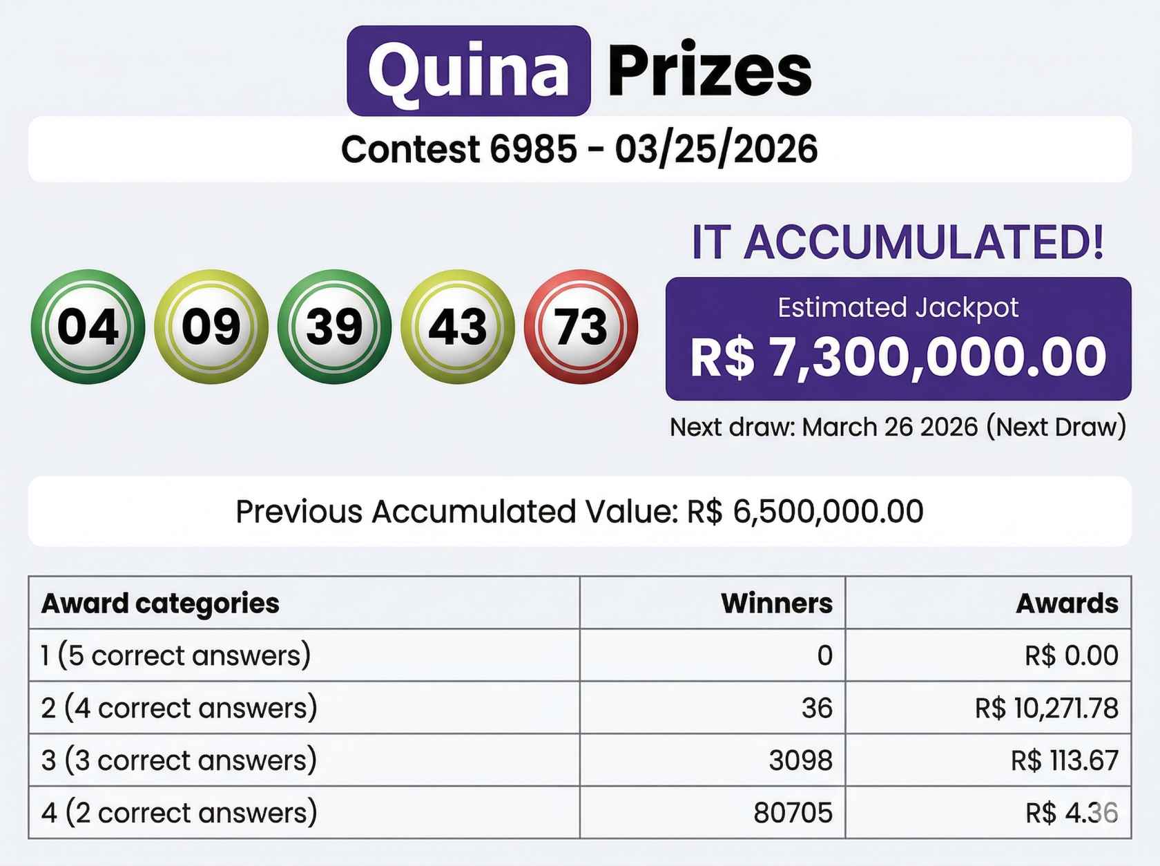 The Quina draw for contest 6985 held on March 25 2026 ended without a top prize winner, pushing the jackpot higher and increasing excitement for the next draw. With no ticket matching all five numbers, the main prize now rolls over to an estimated R$7.3 million.