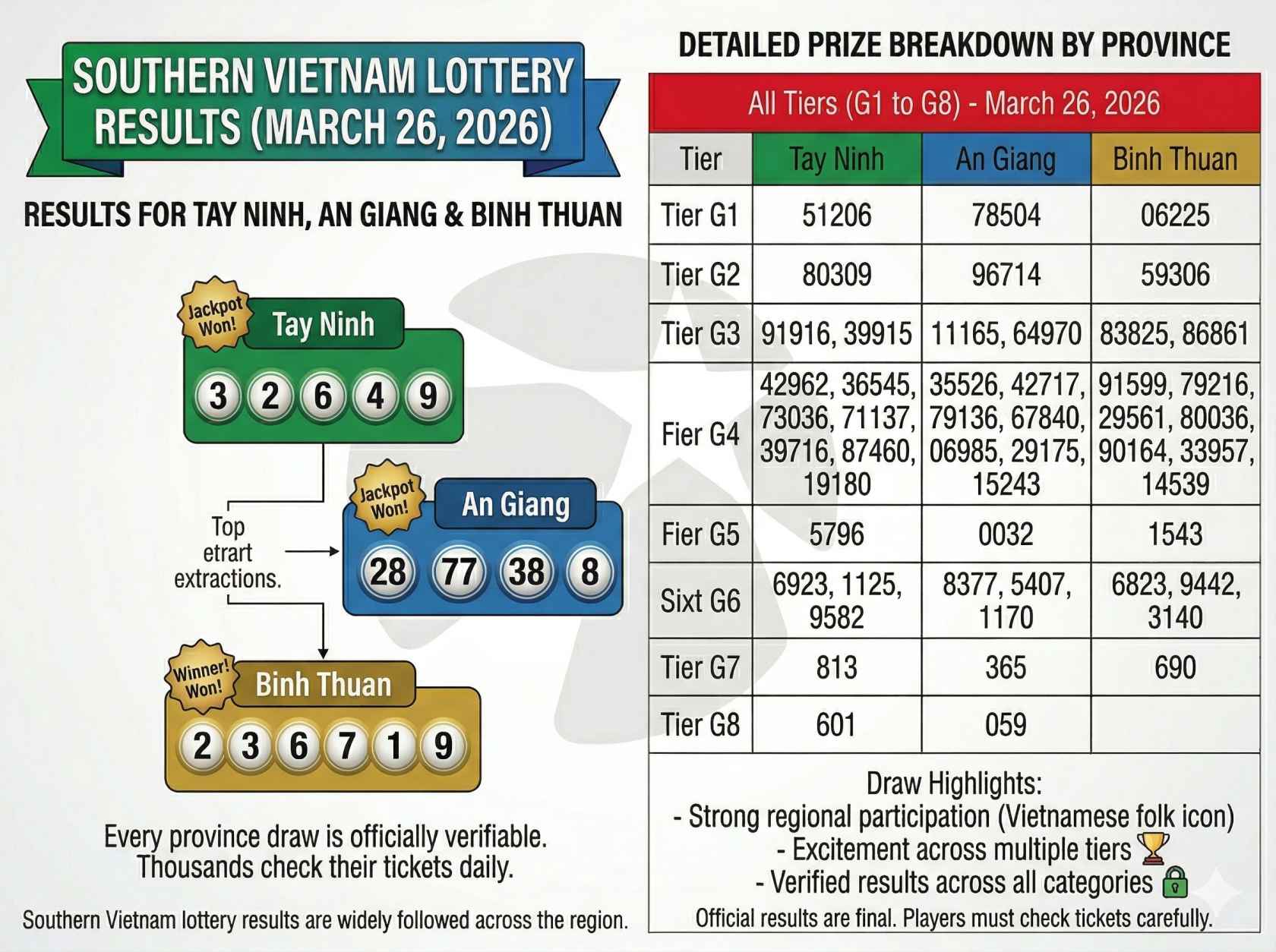 The Southern Vietnam lottery draw held on March 26 2026 delivered exciting results across three provinces Tay Ninh An Giang and Binh Thuan. Thousands of players checked their tickets as major prizes including the special prize were announced.