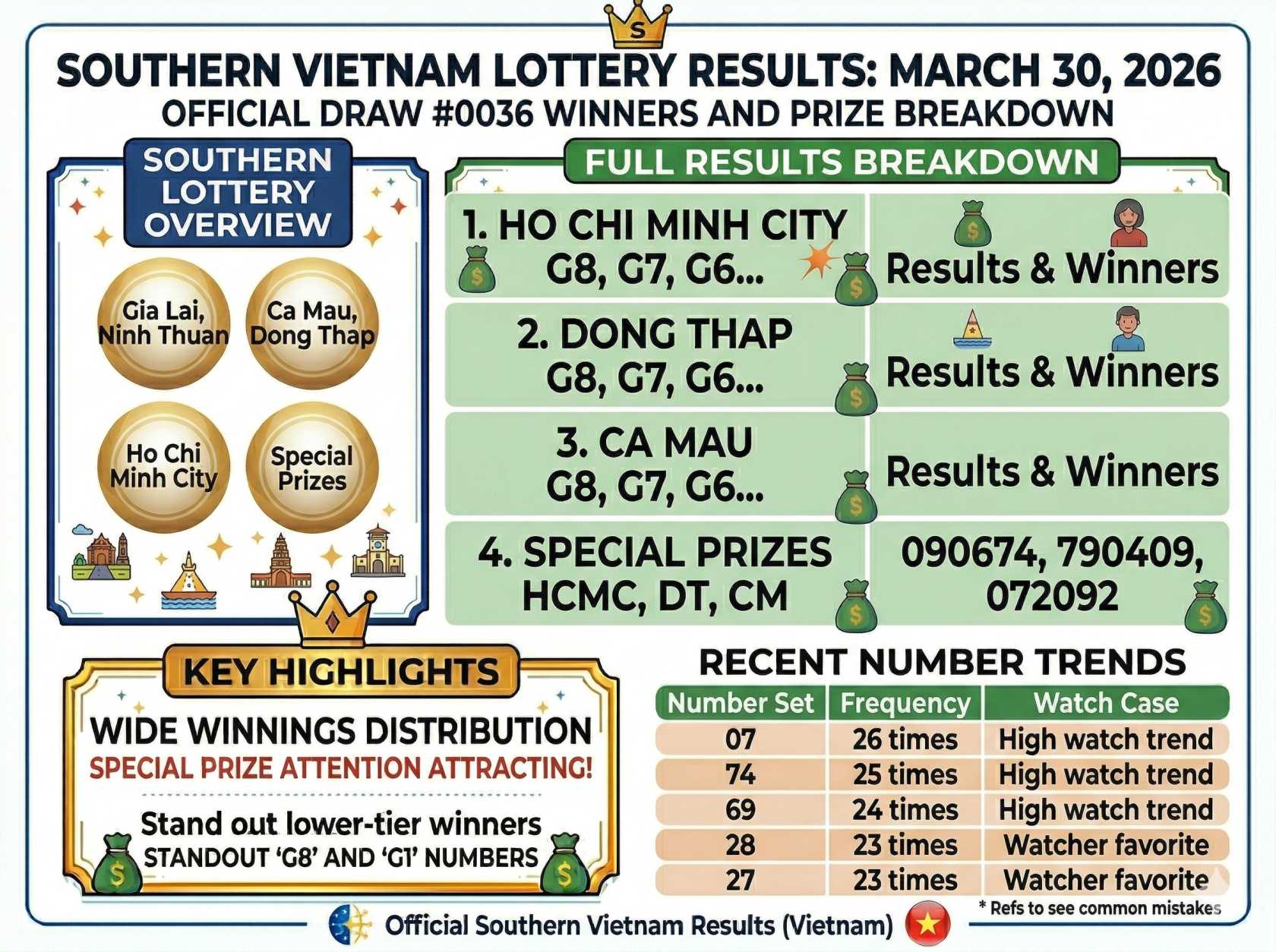The latest Southern Vietnam Lottery draw March 30 2026 has officially been released, bringing updated results from Ho Chi Minh City, Dong Thap, and Ca Mau. Thousands of players across the region checked their tickets as prize tiers from G8 to the Special Prize were announced.