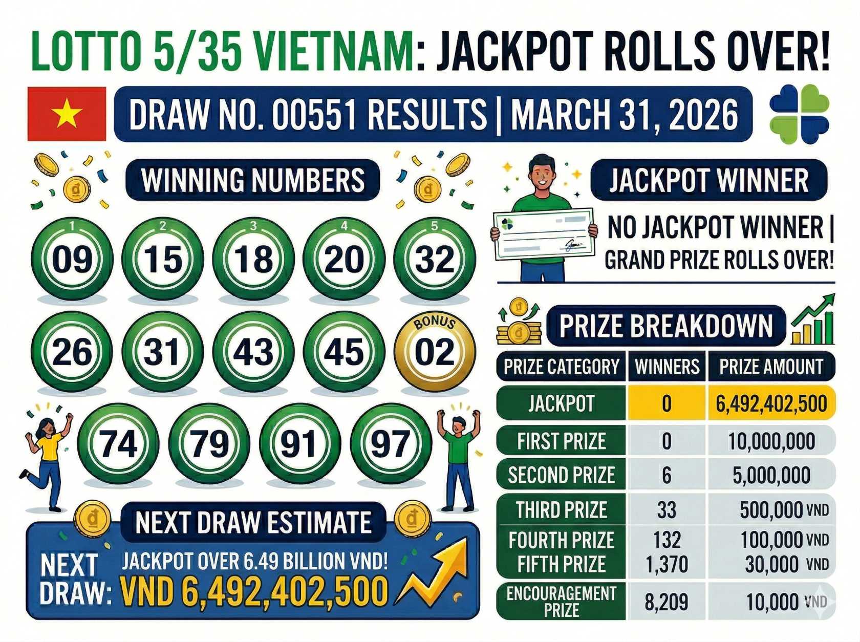 The latest Lotto 5/35 draw held on March 31 2026 delivered exciting results for players across Vietnam, even as the jackpot remained unclaimed. Draw number 00551 saw thousands of winners across lower prize tiers, while the top prize of over 6.49 billion VND rolls over to the next draw.