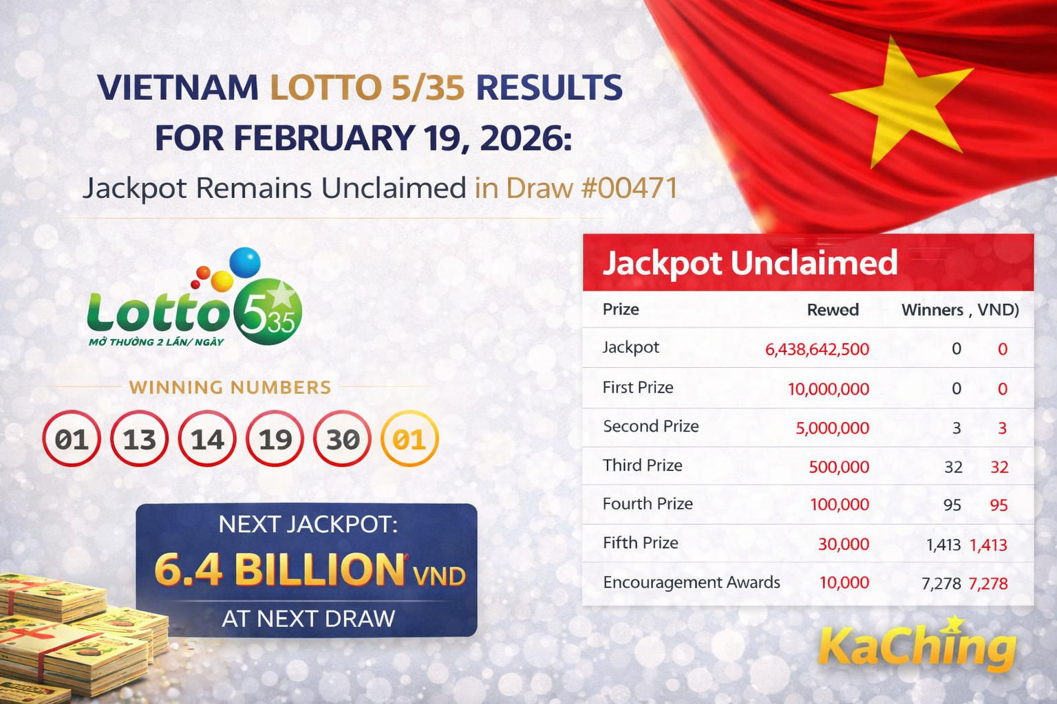 Vietnam’s Lotto 5/35 draw held on Wednesday, February 19, 2026, concluded without a jackpot winner, according to the official results released after Draw #00471. While the top prize went untouched, thousands of players across the country secured lower-tier rewards, keeping interest high for upcoming draws.