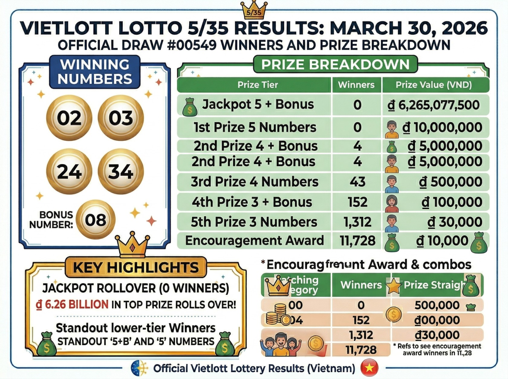 The latest Vietlott Lotto 5/35 draw held on March 30 2026 ended without a jackpot winner, pushing the grand prize to an even higher level for the next draw. While no one matched all five main numbers plus the bonus ball, thousands of players still secured lower tier prizes across Vietnam.