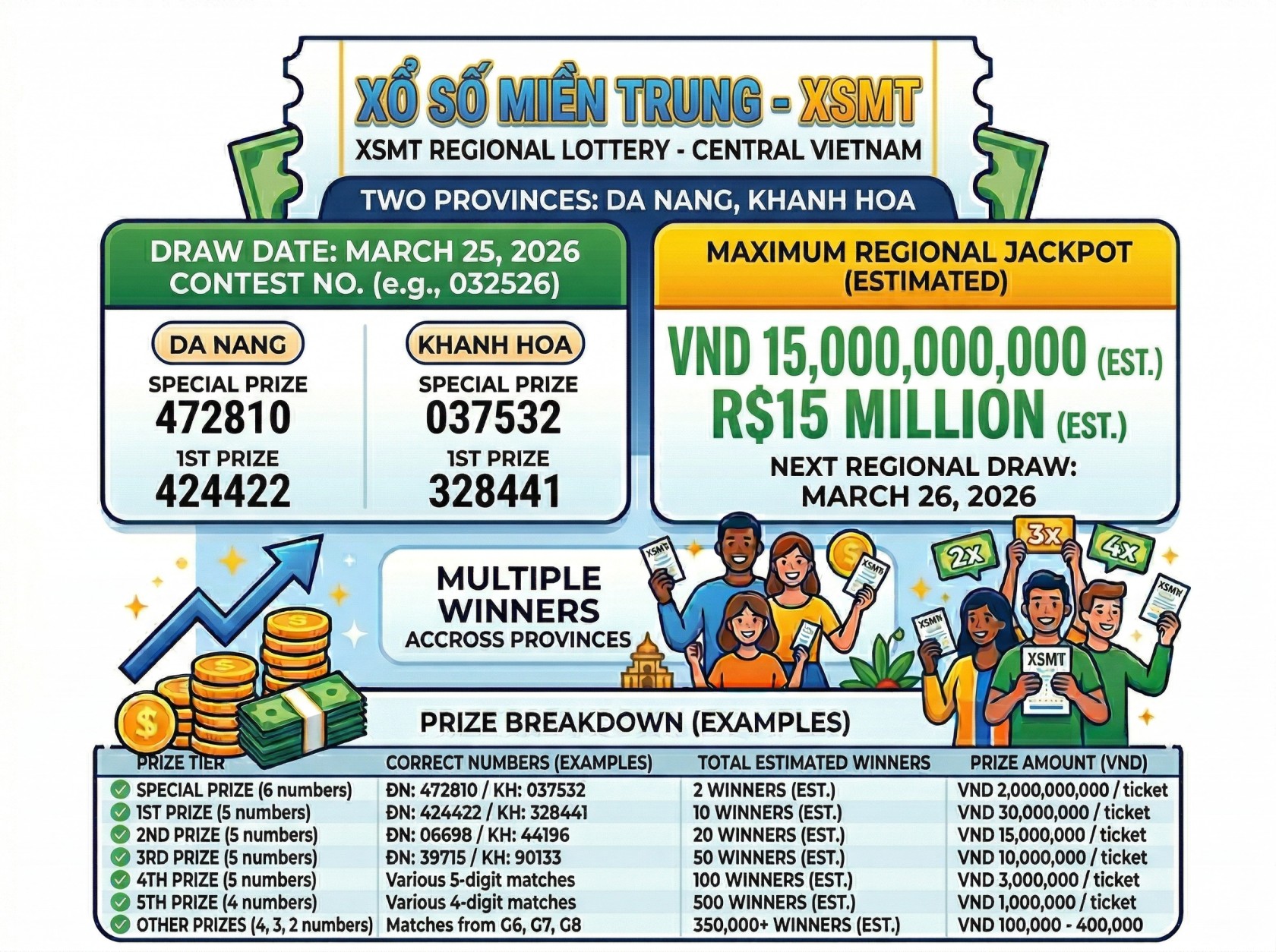 With multiple prize tiers and two provinces participating, the Central Vietnam lottery continues to offer frequent chances to win.